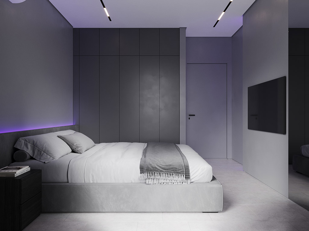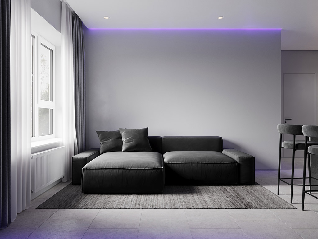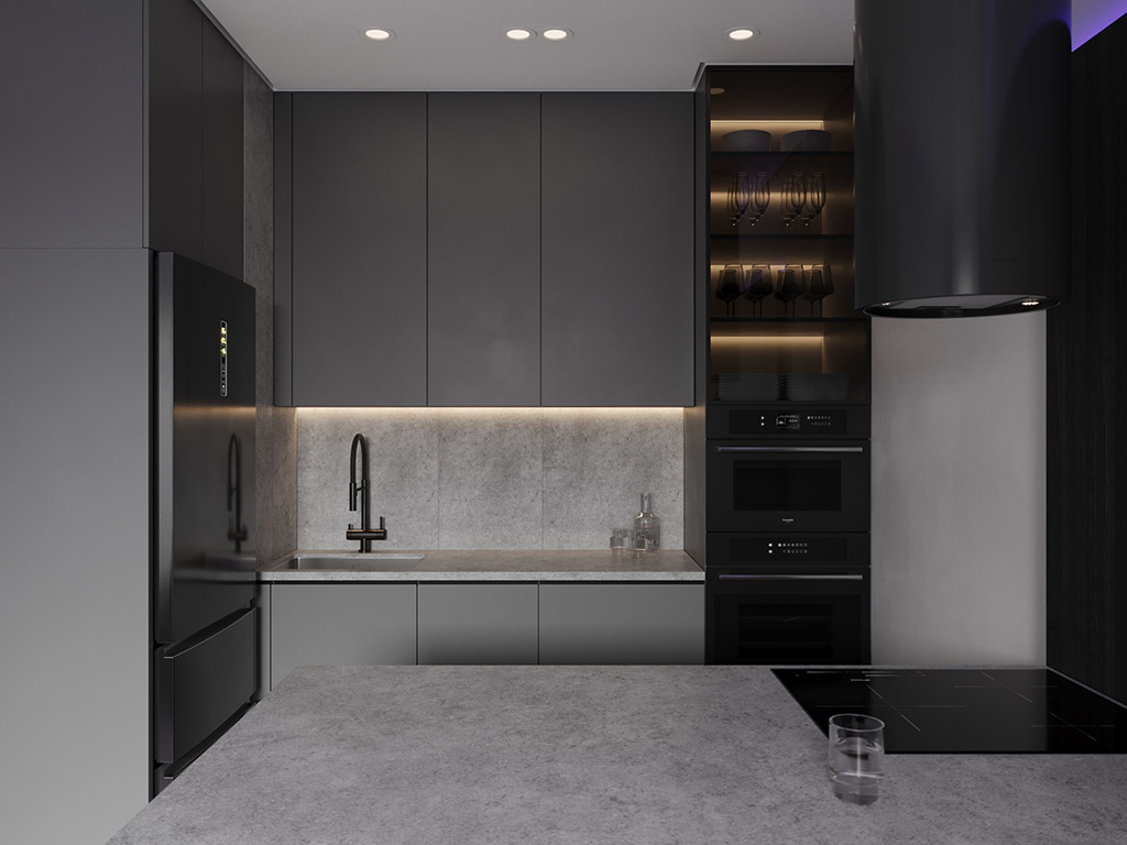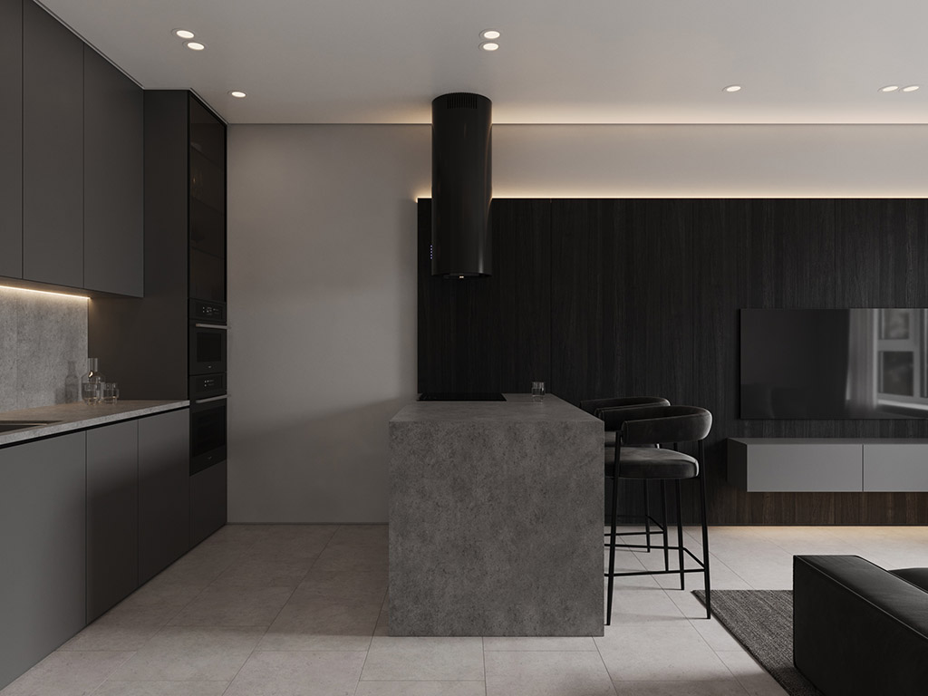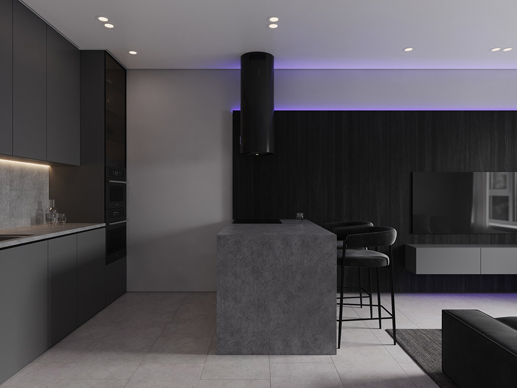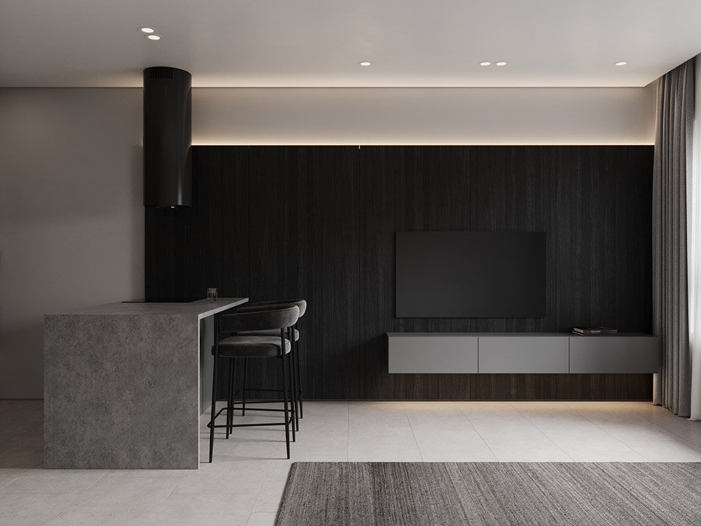 Интерьер напоминает укромное место в глубине пещеры, куда едва проникает свет, и в этом есть особый шарм и магия. Большая часть мебели выполнена монохромной, гармонируя со стенами, дополнена тёмным текстурным деревом. В каждом помещении предусмотрена скрытая разноцветная подсветка, позволяющая менять настроение пространства.