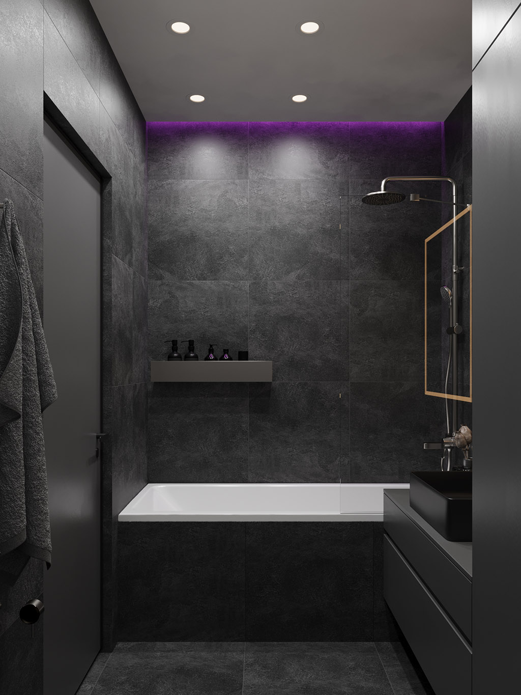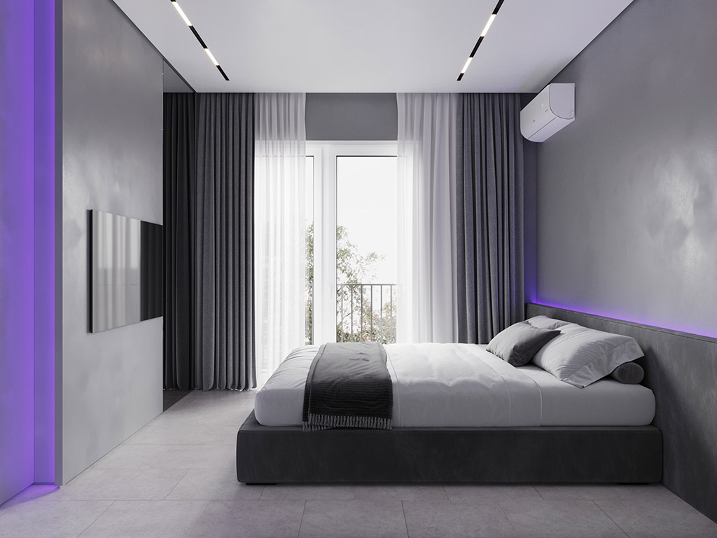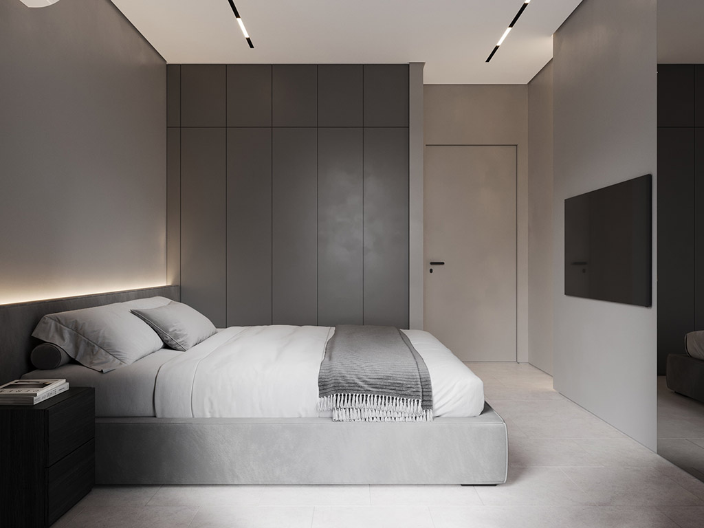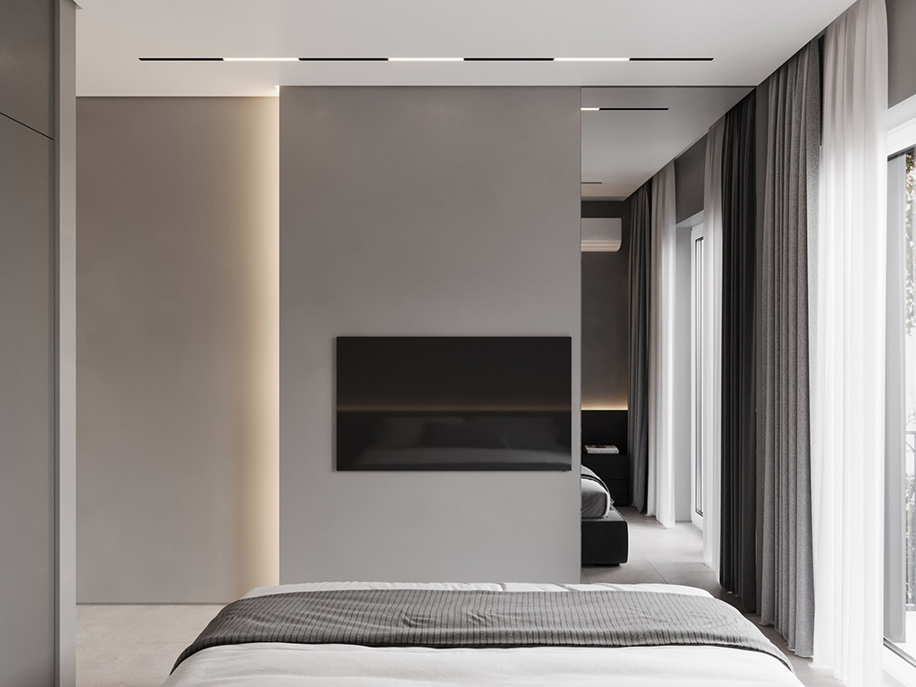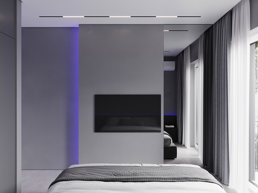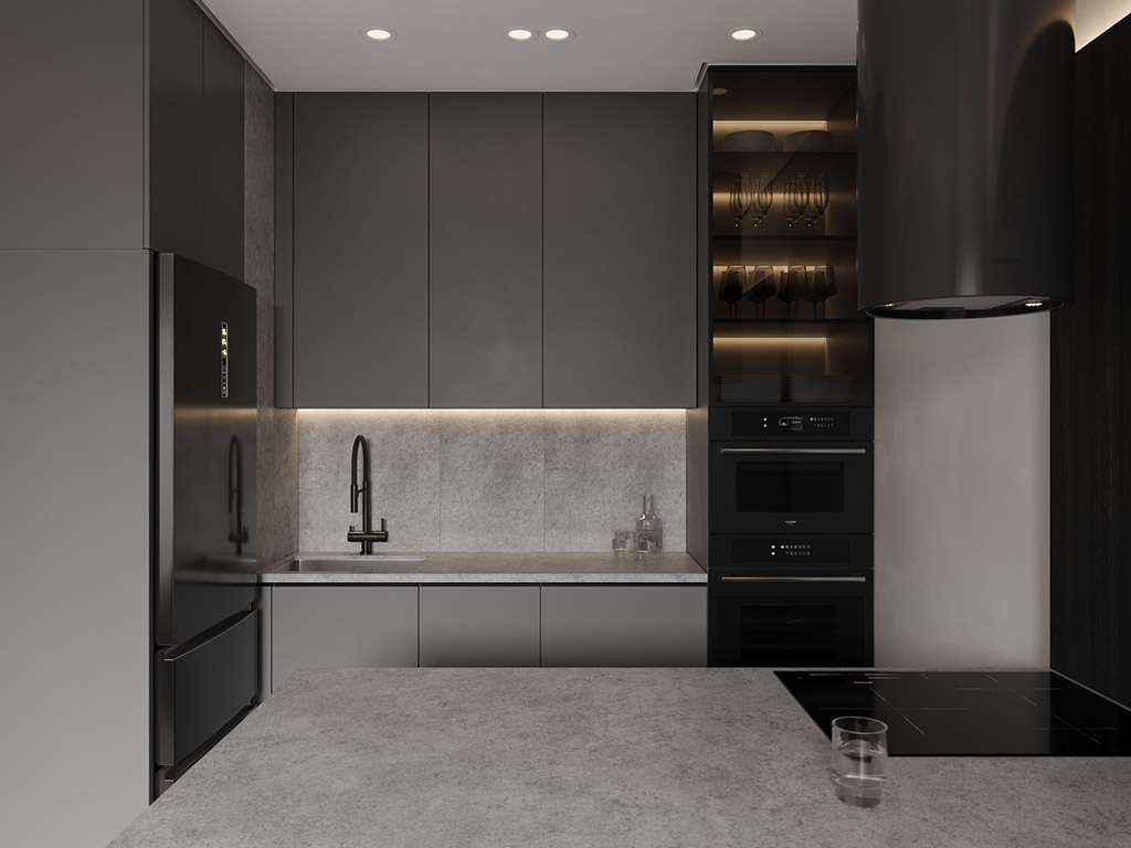 Интерьер напоминает укромное место в глубине пещеры, куда едва проникает свет, и в этом есть особый шарм и магия. Большая часть мебели выполнена монохромной, гармонируя со стенами, дополнена тёмным текстурным деревом. В каждом помещении предусмотрена скрытая разноцветная подсветка, позволяющая менять настроение пространства.