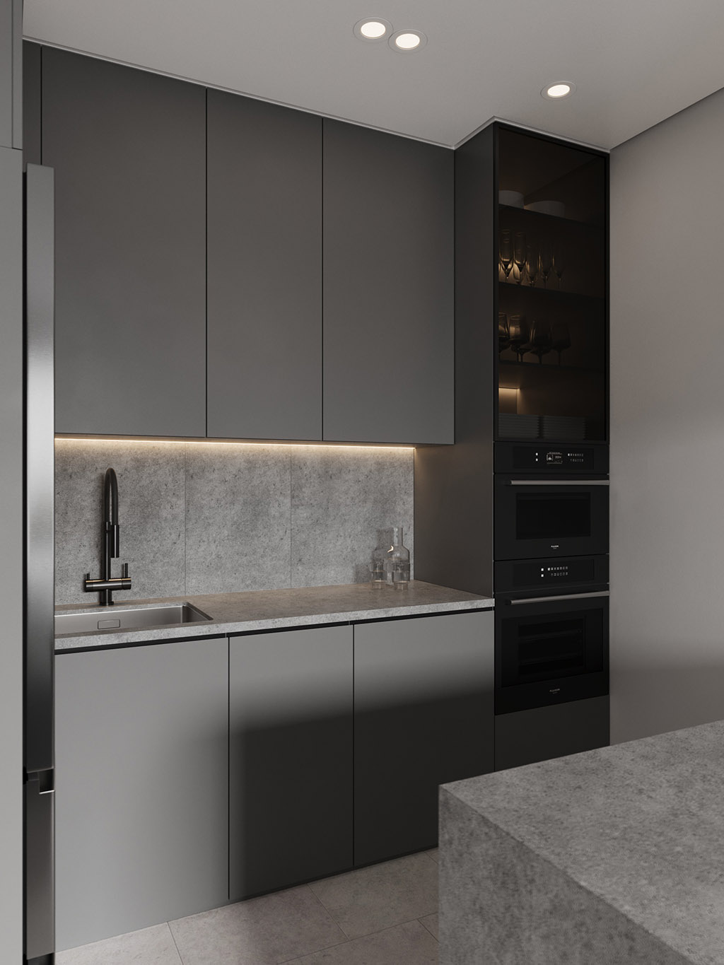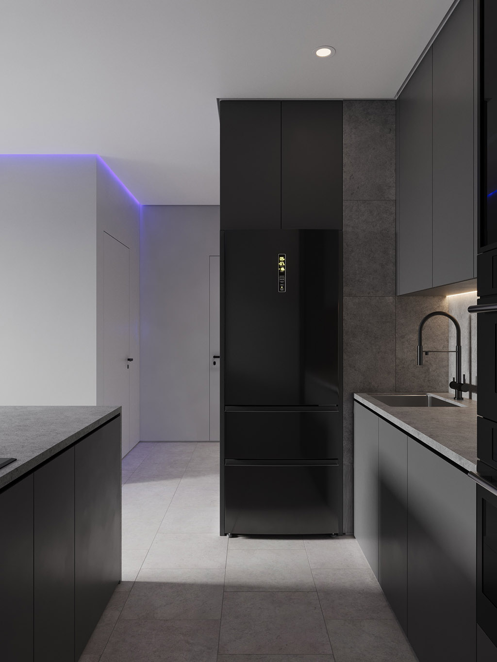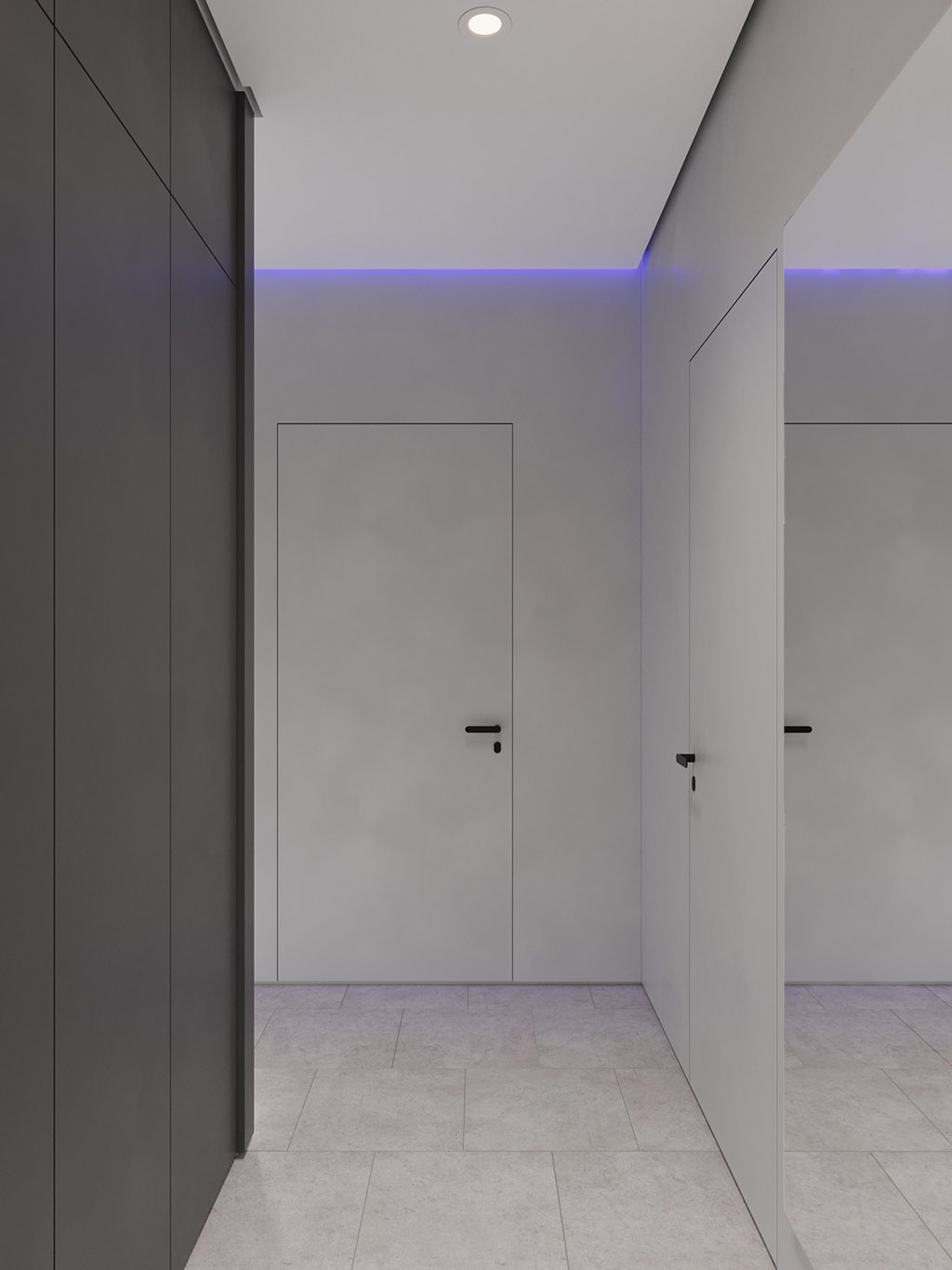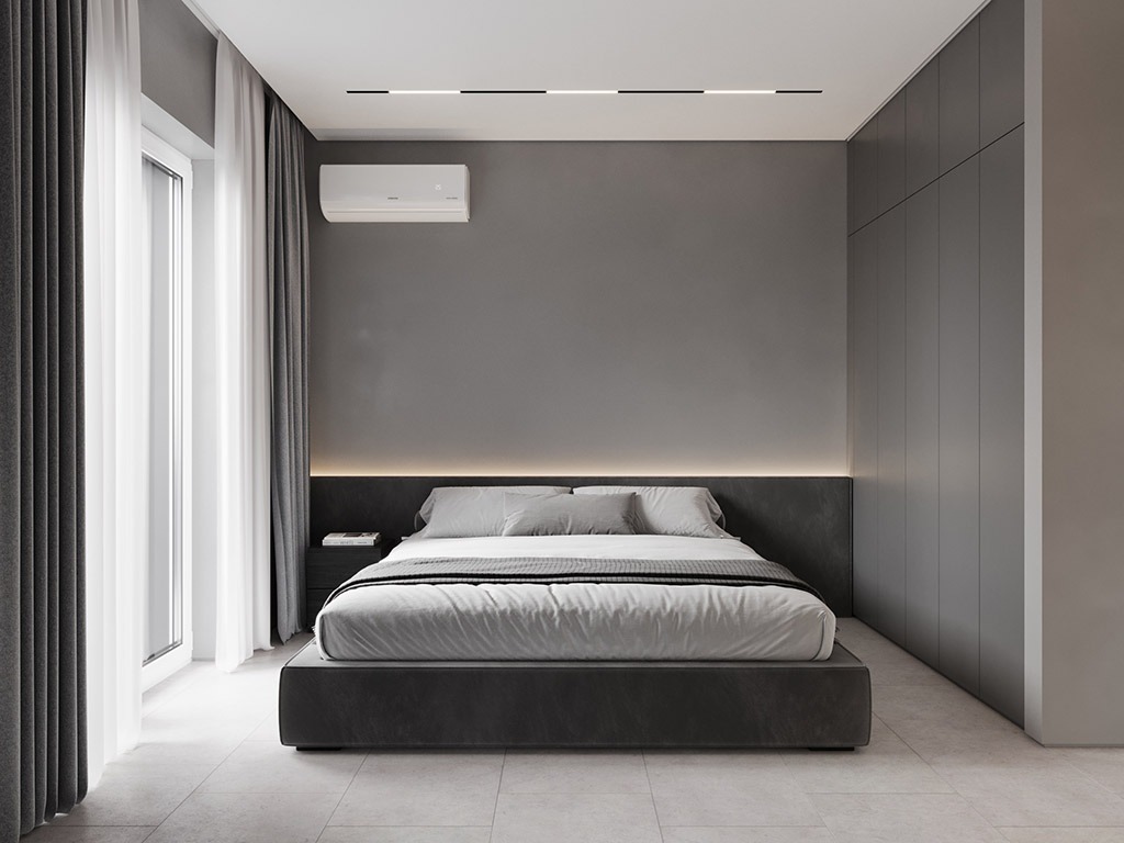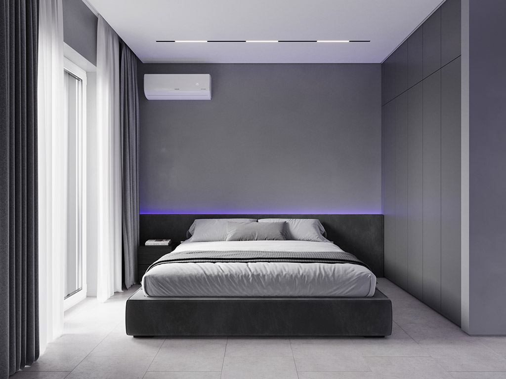 Интерьер напоминает укромное место в глубине пещеры, куда едва проникает свет, и в этом есть особый шарм и магия. Большая часть мебели выполнена монохромной, гармонируя со стенами, дополнена тёмным текстурным деревом. В каждом помещении предусмотрена скрытая разноцветная подсветка, позволяющая менять настроение пространства.