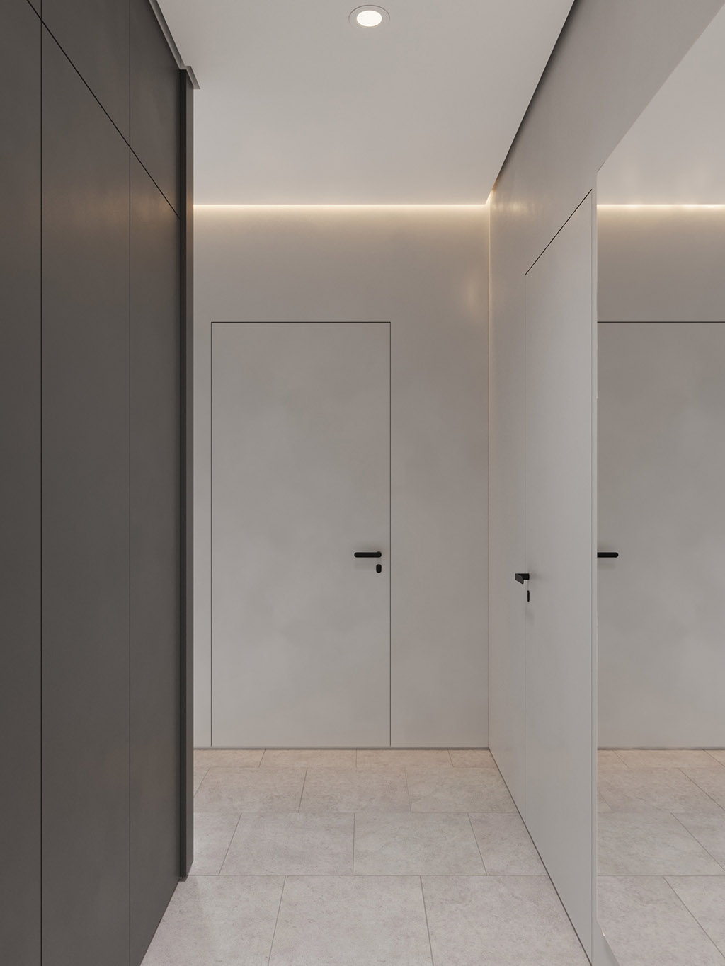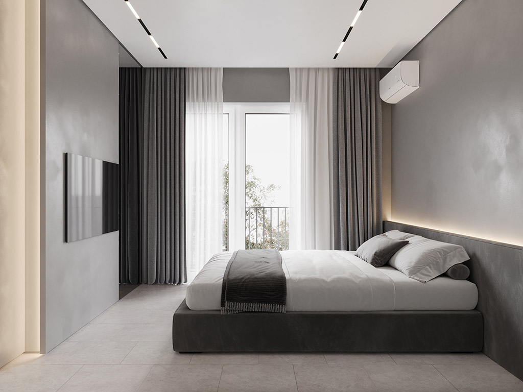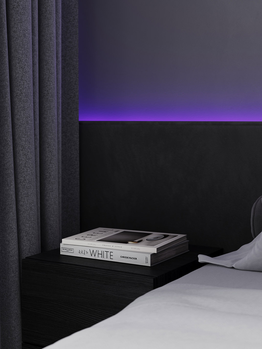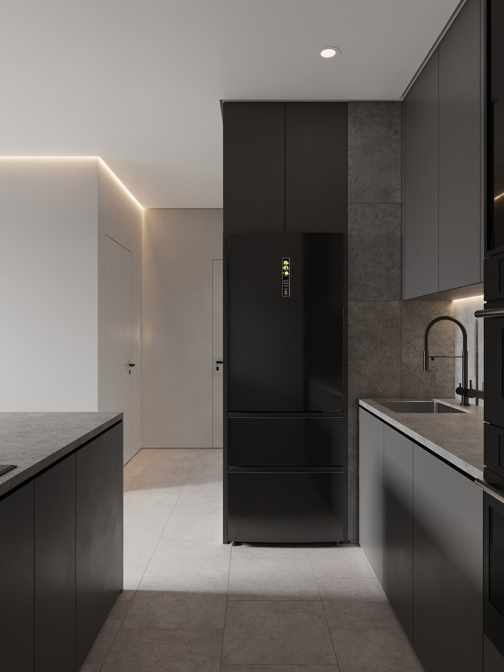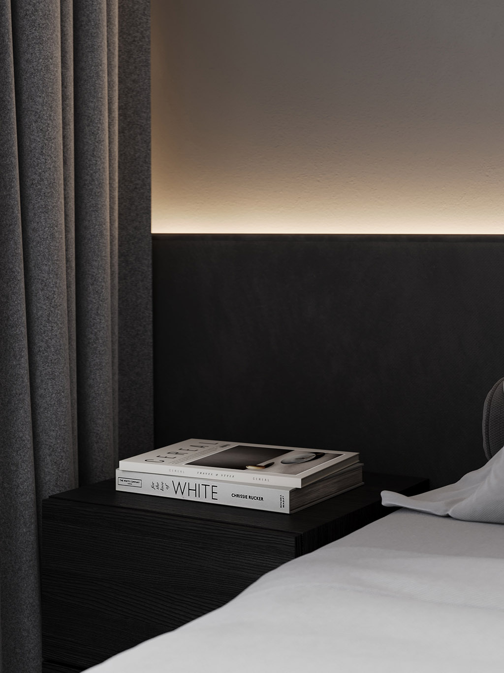 Интерьер напоминает укромное место в глубине пещеры, куда едва проникает свет, и в этом есть особый шарм и магия. Большая часть мебели выполнена монохромной, гармонируя со стенами, дополнена тёмным текстурным деревом. В каждом помещении предусмотрена скрытая разноцветная подсветка, позволяющая менять настроение пространства.