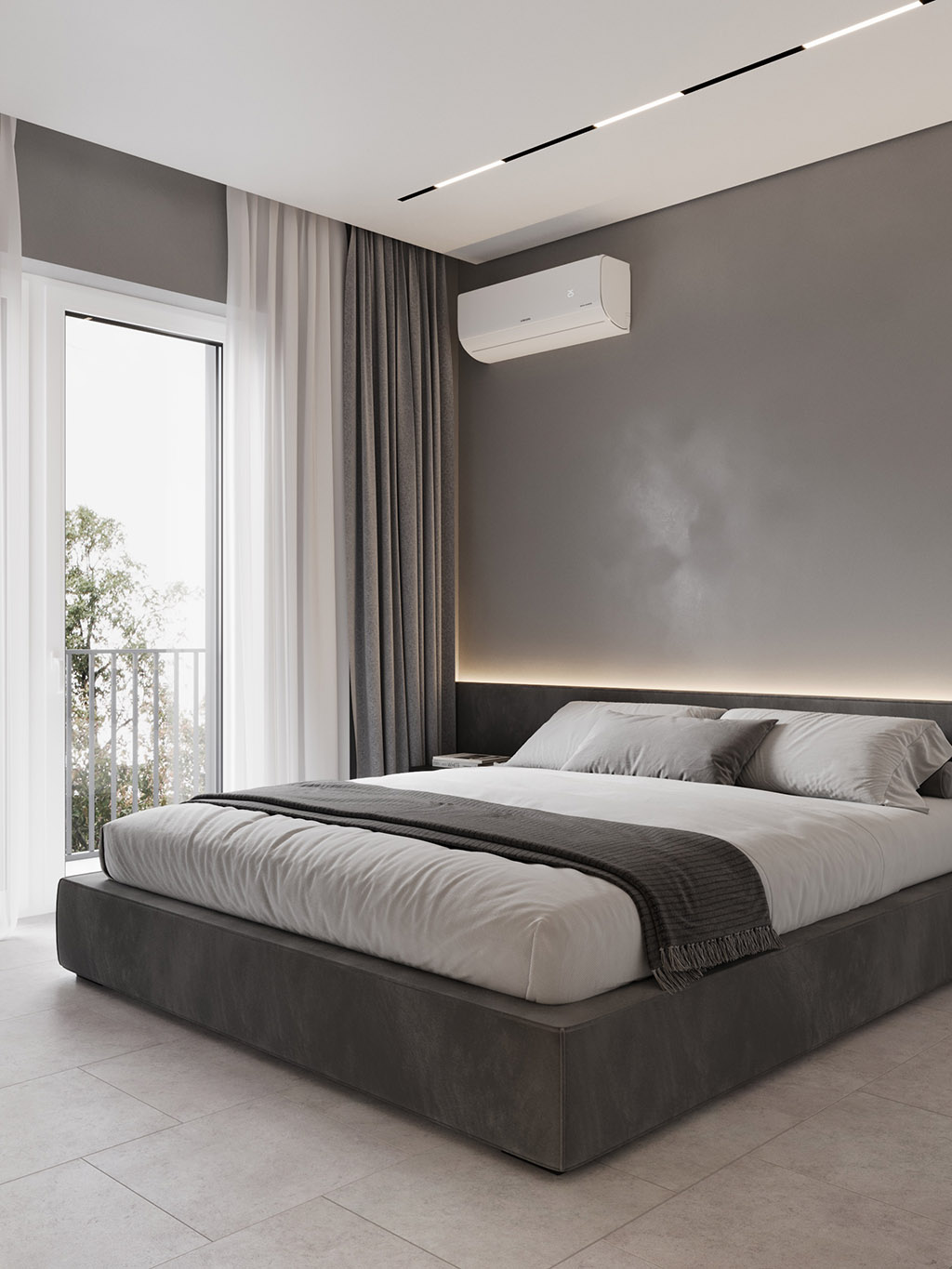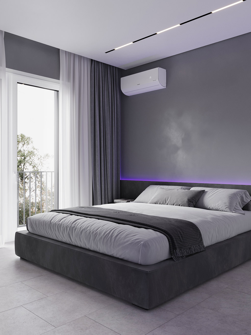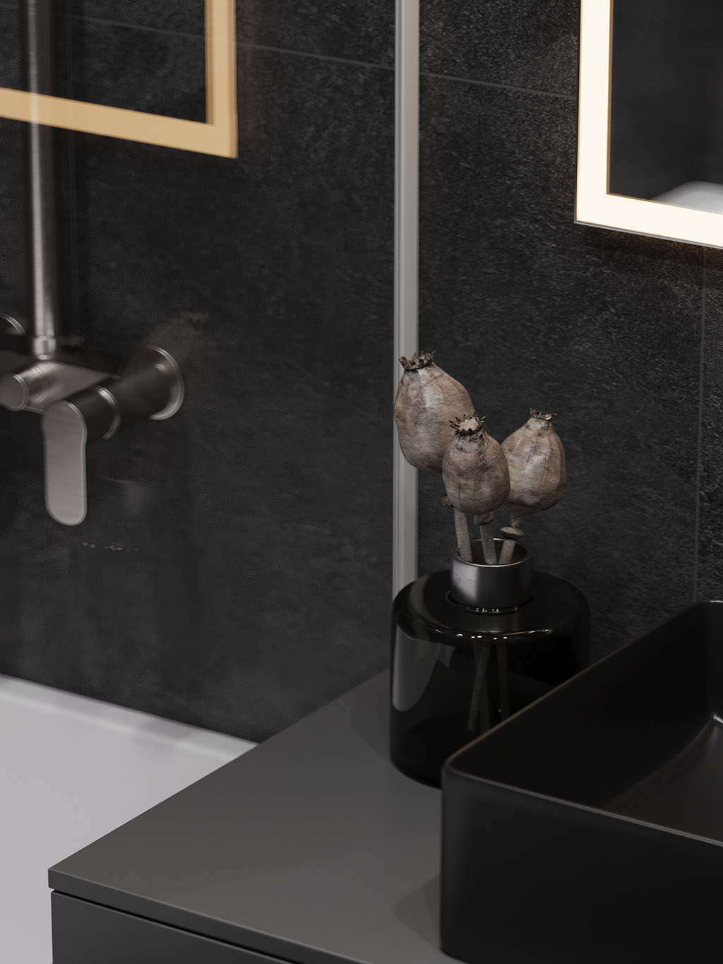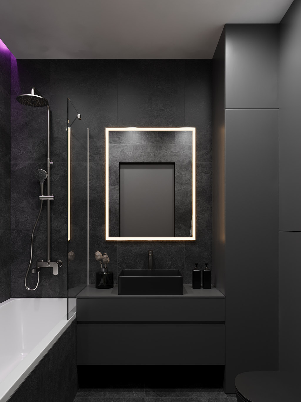 Интерьер напоминает укромное место в глубине пещеры, куда едва проникает свет, и в этом есть особый шарм и магия. Большая часть мебели выполнена монохромной, гармонируя со стенами, дополнена тёмным текстурным деревом. В каждом помещении предусмотрена скрытая разноцветная подсветка, позволяющая менять настроение пространства.