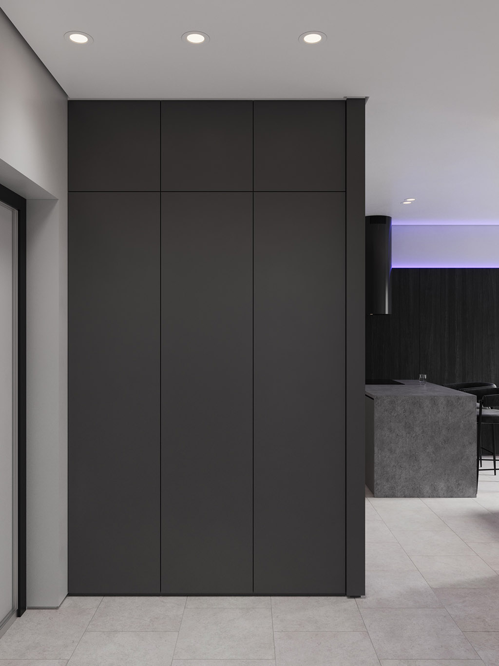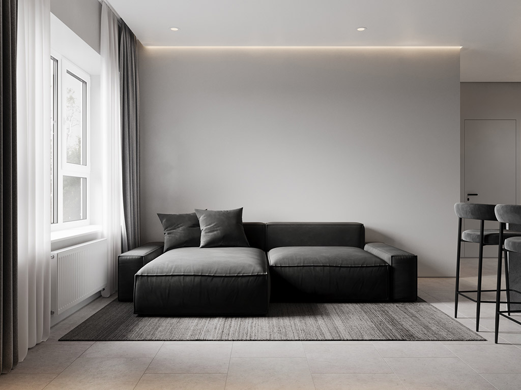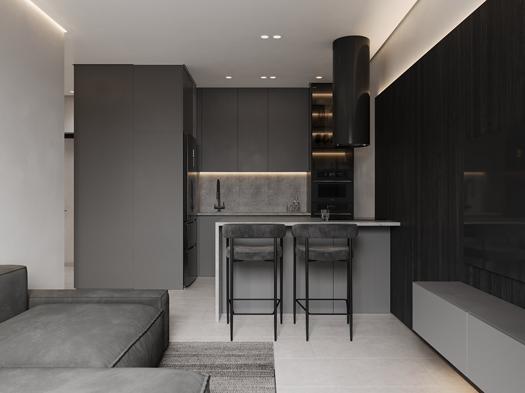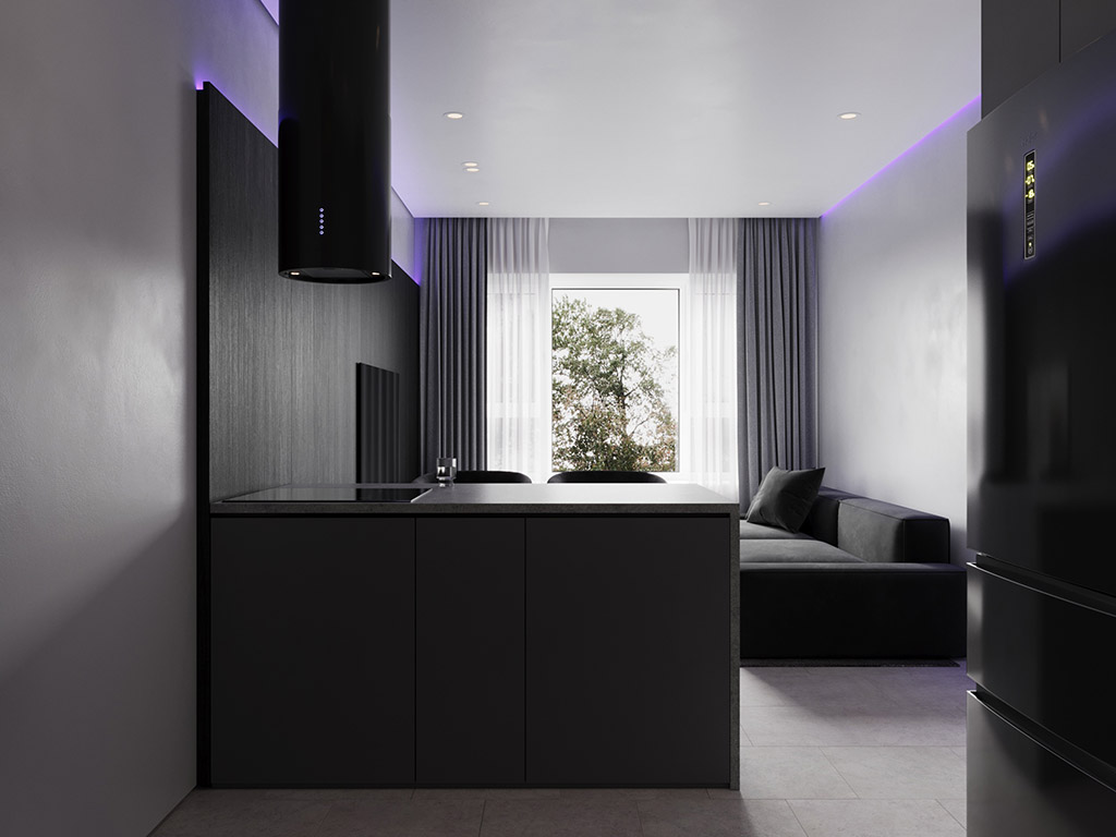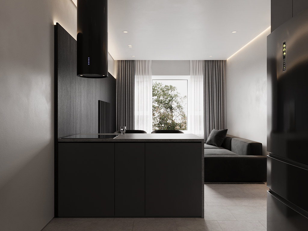 Проект квартиры был создан для молодой девушки, которая главным и единственным пожеланием указала визуальную цветовую эстетику в темных ахроматических тонах.