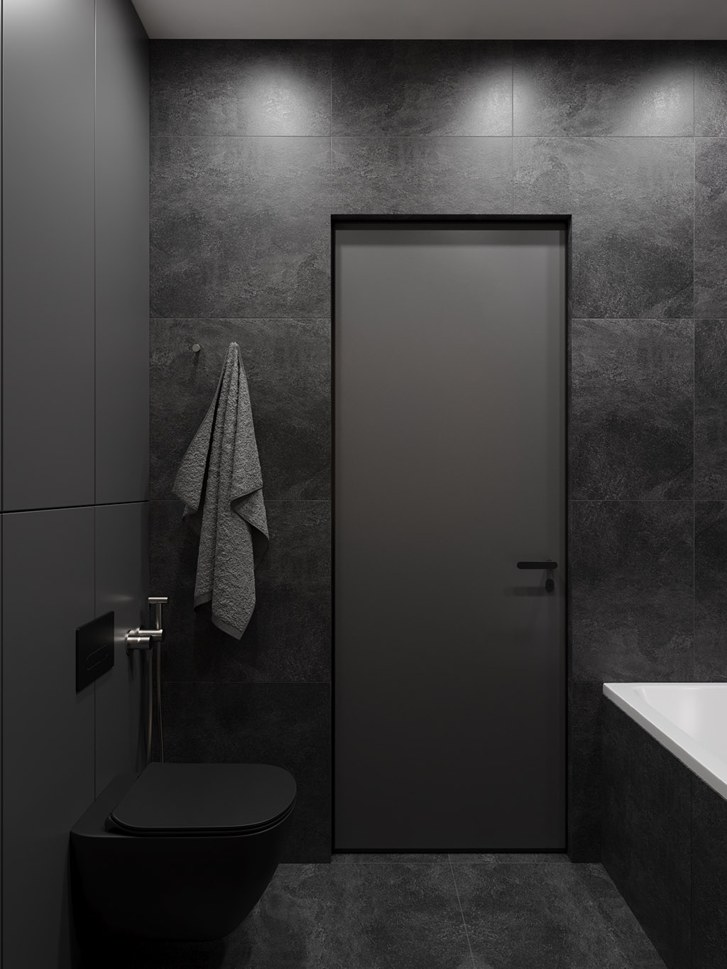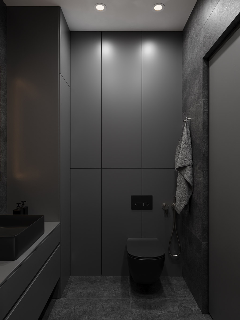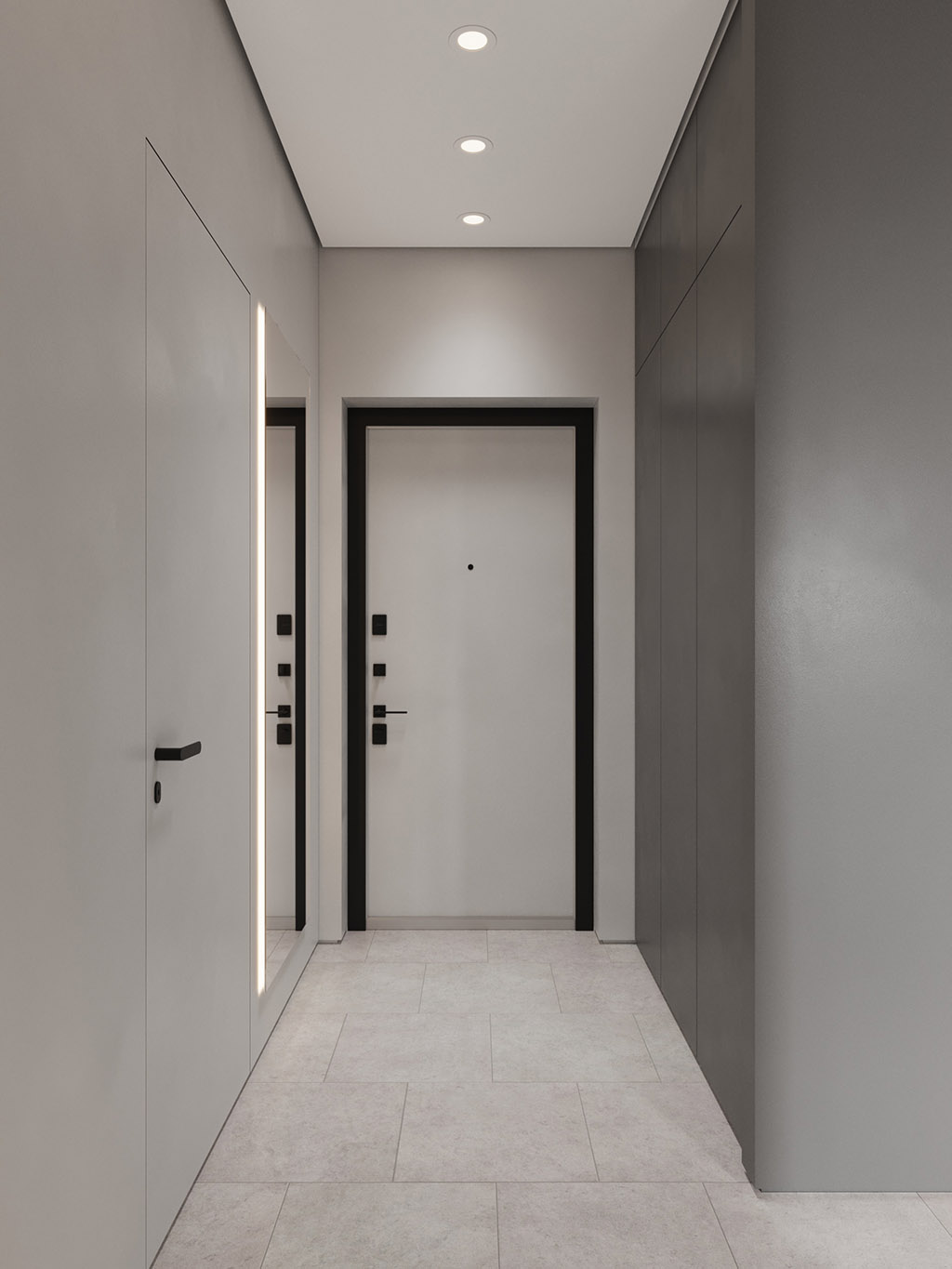 Проект квартиры был создан для молодой девушки, которая главным и единственным пожеланием указала визуальную цветовую эстетику в темных ахроматических тонах.